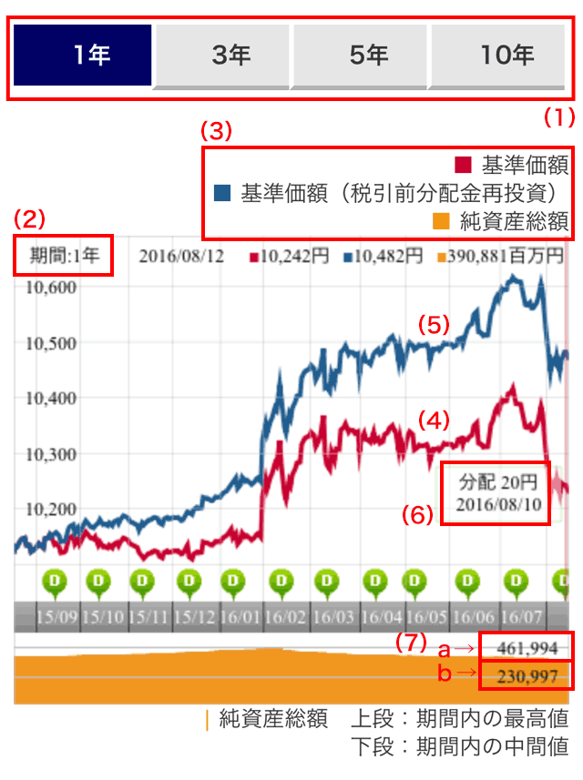 カーソルを合わせた箇所の日付、基準価額、基準価額(分配金再投資)、純資産額を表示します。